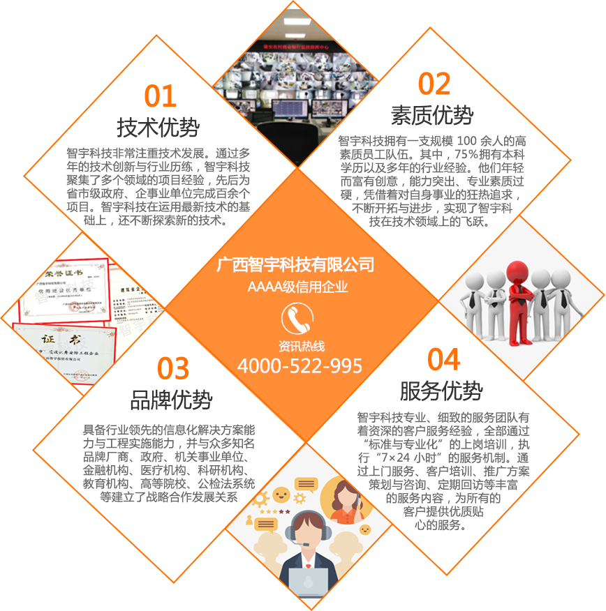 廣西智宇科技有限公司,自1995年成立以來,已發(fā)展成為一家高新技術(shù)企業(yè),擁有多家分公司,遍布南寧、桂林、玉林、河池、扶綏、百色、欽州、防城港等地。憑借30年的專業(yè)經(jīng)驗和技術(shù)儲備,智宇科技已成為一家行業(yè)領(lǐng)先的集團企業(yè),致力于運用前沿科技產(chǎn)品和技術(shù),為客戶提供高效服務(wù)。